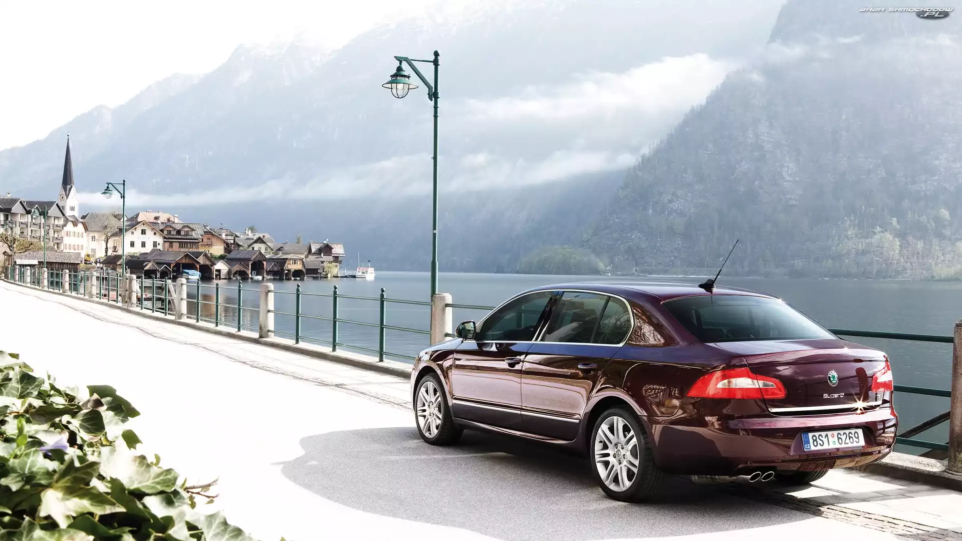 Droga, Brązowa, Rzeka, Góry, Skoda, Miasteczko- Zdjęcia samochodów